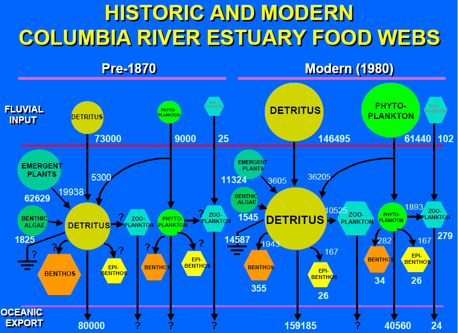 The figure at bottom right shows postulated historical shifts in organic carbon sources (106 metric tons Carbon y-1) (based on Sherwood et al. 1990, in Simenstad 2001).