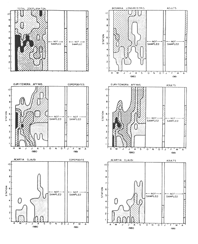 The figure at bottom left shows seasonal density of total zooplankton, upper estuary cladocerans, and mid and lower estuary copepods (Jones et al. 1990).