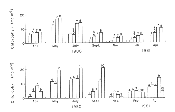 The figure at bottom right shows mean water-column chl a concentrations by sampling months and by regions along the main estuary axis (top) and in the shallows and tributary rivers (bottom) (Small et al. 1990)