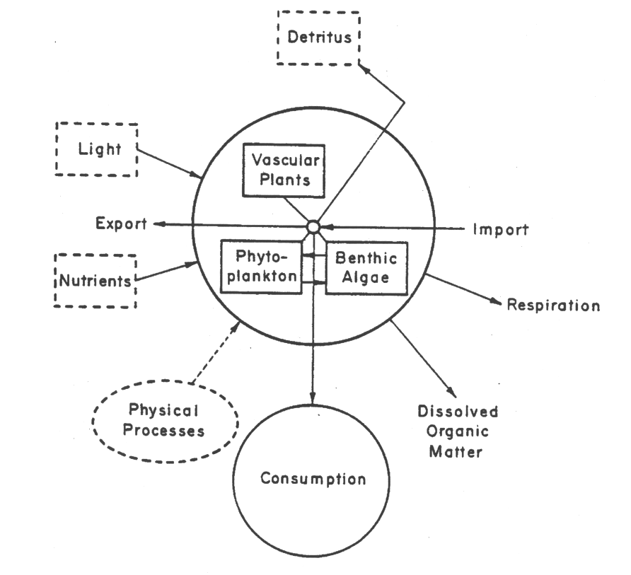 The figure at right is a systems diagram of estuarine processes based on primary production (modified from McIntire et al. 1983).