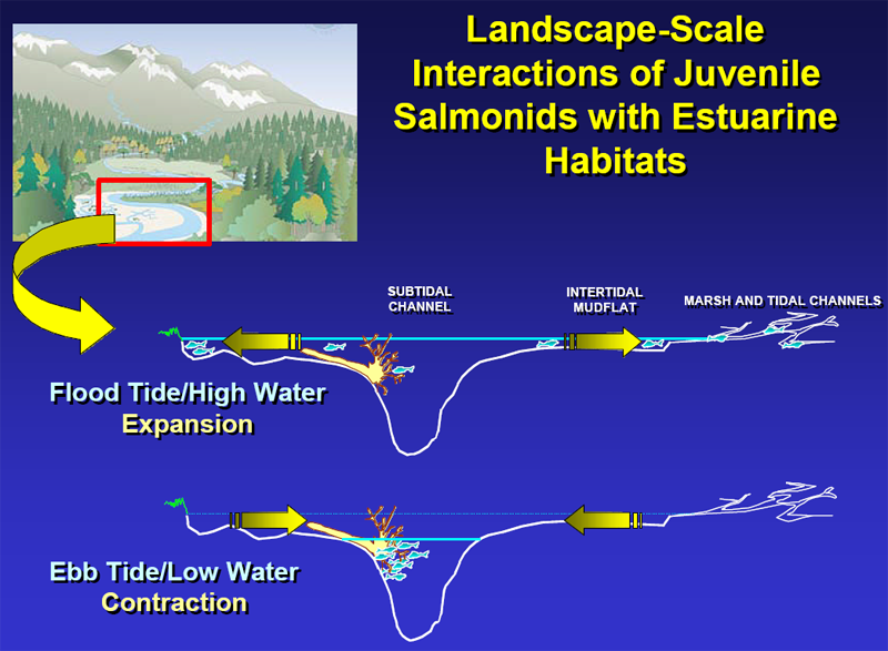 The figure at bottom left shows the use of large woody debris and channel habitat by juvenile salmon in the estuary (Simenstad 2001).
