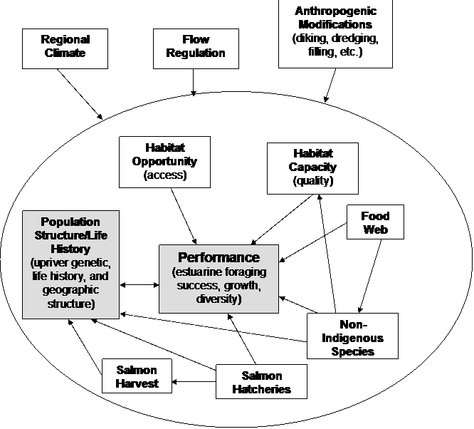 The figure at bottom right shows that salmon performance within the estuary is directly linked to population structure upriver, habitat opportunity, and habitat capacity. Hatchery releases, salmon harvest, and watershed modifications alter population structure and also may affect patterns of salmon rearing and migration in the estuary (Bottom et al. 2001).