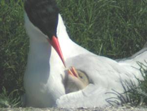 Reproduction is the generation of offspring, which maintains plant and animal populations. Caspian terns (at right) rely on nesting habitat in the Columbia River estuary (photo courtesy Keith Larson, OSU). In 2002, nearly 10,000 breeding pairs nested on East Sand Island, which comprises approximately two-thirds of the west coast population of breeding adults (Myers et al. 2004). Caspian terns feed on small fish, in particular juvenile salmonids leaving the estuary. The tern population in the Columbia River estuary was moved from Rice Island (river mile 21) to East Sand Island (river mile 5) in 2000 because studies indicated that the terns were consuming 10-12% of all young salmon that reached the estuary each year (Roby et al. 2003). This proximity to the mouth of the river has resulted in a shift in the terns diets to marine forage fish, with a 50% reduction in salmonid smolt mortality due to tern predation.