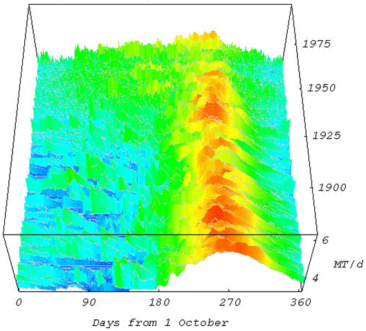The figure at bottom left shows total sediment load in the Columbia estuary at Vancouver for observed flow, 1878-1999 (Log10) (Jay 2003).