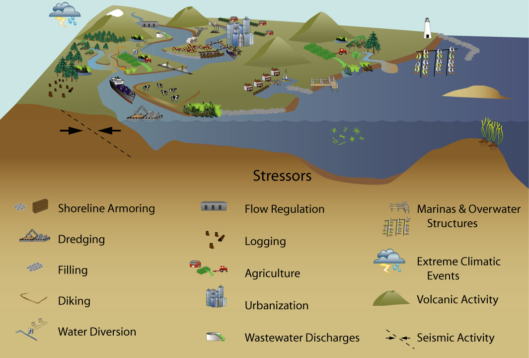 Ecosystem stressors are "out of the ordinary" natural and unnatural inputs to the system that disturb the controlling factors, structure, and processes in the ecosystem. Stressors produce potentially large-scale effects on the natural spatial and temporal dynamics of the system.