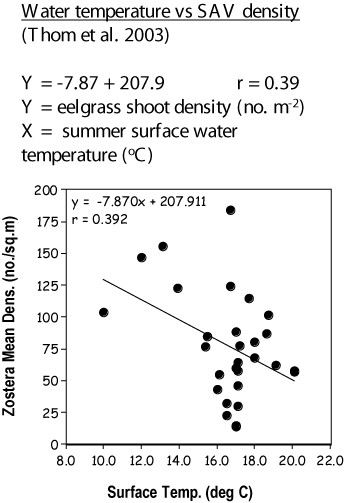 This relationship shows that as average summer water temperature increases up-estuary, the density of eelgrass decreases. These data are from Willapa Bay and Coos Bay estuaries.