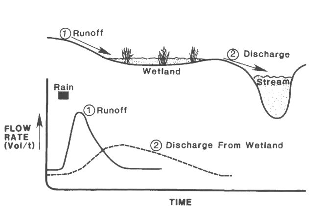The figure at right shows the general effect of wetlands on stream flow (Mitsch and Gosselink 1993).